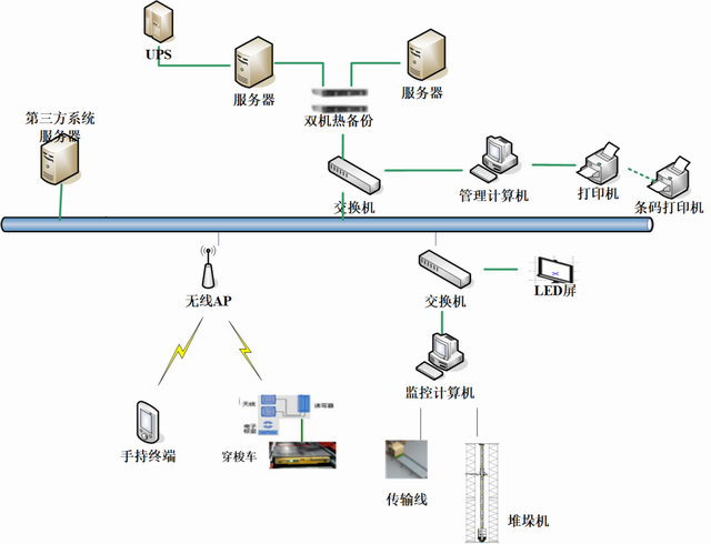 此系統為自動化存取庫房,各穿梭貨架通道內的貨物由穿梭車搬運取送,貨物在各通道端口的上下架及穿梭車的換通道,由堆垛機完成,結合輸送線的設置,實現貨物自庫前出入貨口以內存儲區域的存取全過程自動化。
